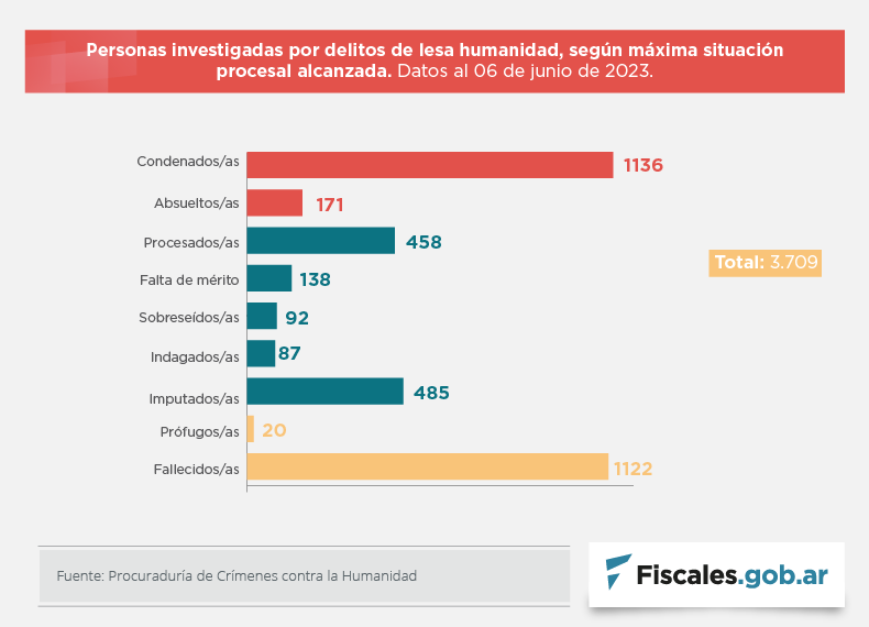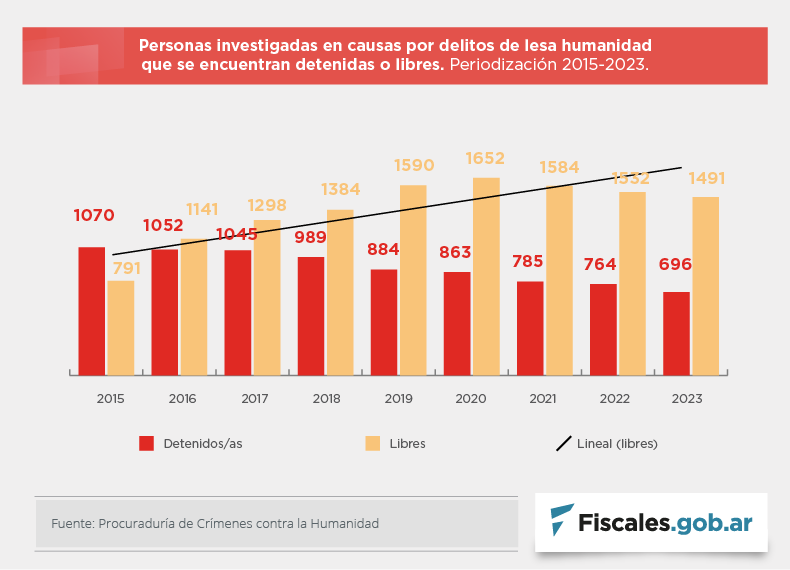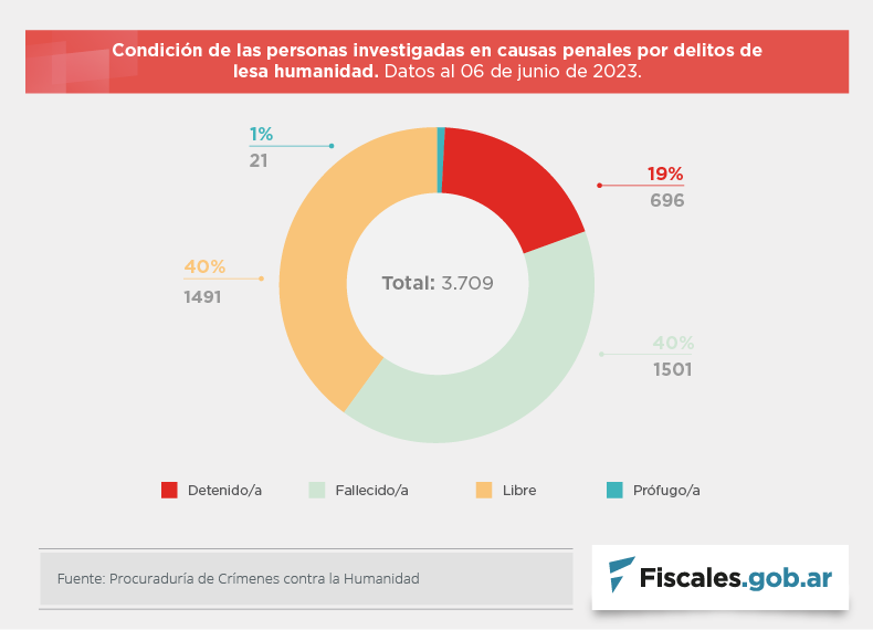 En tanto, las personas vinculadas a causas por crímenes de lesa humanidad que se encuentran en libertad son 1491.. Las personas que se encuentran prófugas del Poder Judicial y sobre quienes se desconoce su paradero suman 21.