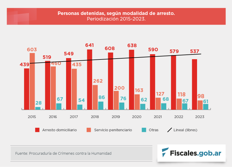 En este marco, la cantidad de personas detenidas suma 696, de las cuales 98 permanecen en establecimientos penitenciarios, 537 cumplen su detención mediante la modalidad de arresto domiciliario y 61 están detenidas en establecimientos categorizados como "otros". La mayoría de estas últimas se encuentran privadas de su libertad en la Unidad N°34 del Servicio Penitenciario Federal con sede en la guarnición militar de Campo de Mayo. Por las características de este lugar -una sede castrense con custodia del Ejército- la Procuraduría de Crímenes Contra la Humanidad no lo considera un establecimiento penitenciario.
