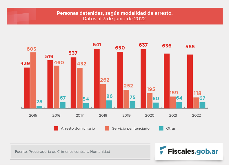 De las personas que están detenidas, 565 se encuentran en arresto domiciliario, 118 en establecimientos penitenciarios y 67 en una categoría denominada "otras" instituciones, cuya mayor proporción refiere a las personas que están alojadas en la Unidad N°34 del Servicio Penitenciario Federal con sede en la guarnición militar de Campo de Mayo. Por las características de este lugar -una sede castrense con custodia del Ejército- la Procuraduría de Crímenes Contra la Humanidad no lo considera un establecimiento penitenciario.