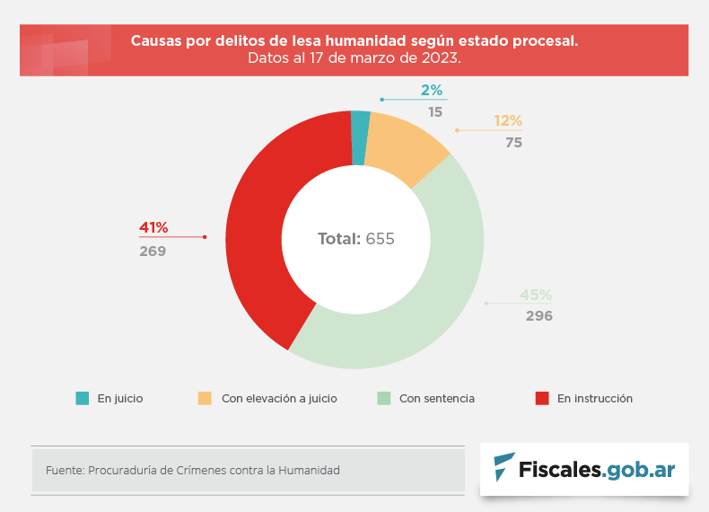 En la actualidad se llevan a cabo 15 juicios en diferentes jurisdicciones del país y otras 75 causas aguardan la fijación de fecha para el inicio del debate. En la fase de instrucción, es decir en plena investigación, tramitan 269 causas, que representan un 41% del total de las causas por crímenes de lesa humanidad.