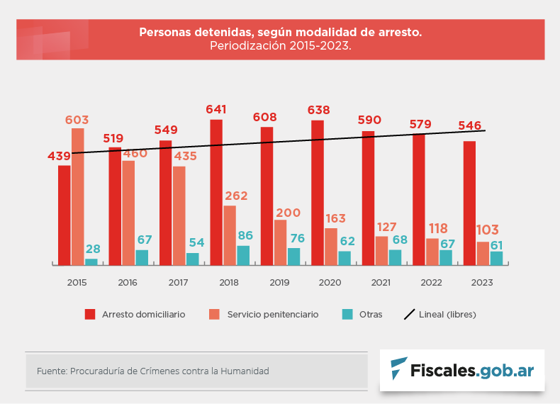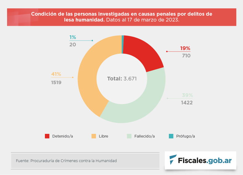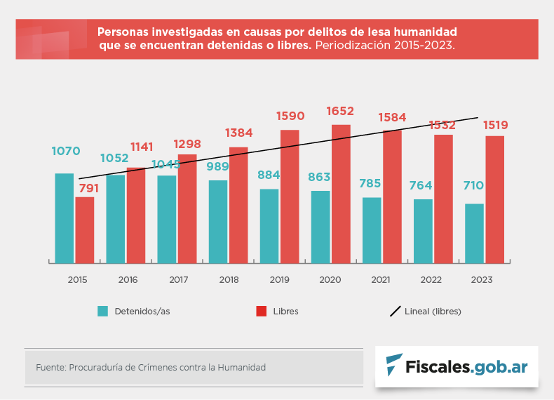 En cuanto a la condición de las personas investigadas por crímenes de lesa humanidad, actualmente hay 710 detenidas, lo cual representa el 19%, y 1519 están libres, es decir, un 41%. Como se expone en el siguiente gráfico, la estadística histórica demuestra que a partir de 2016 las personas en libertad en procesos por crímenes de lesa humanidad superaron a las detenidas.