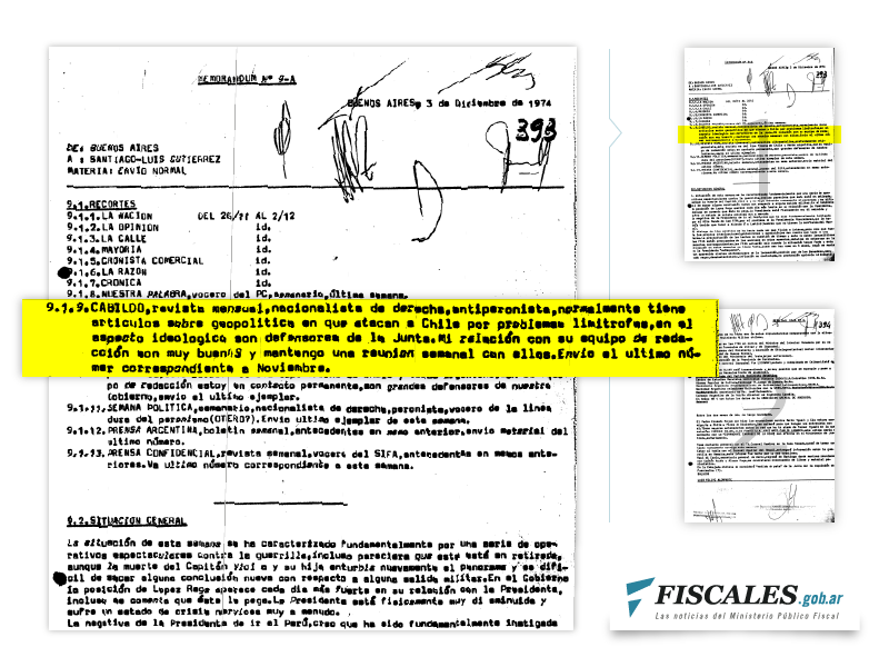 En otro documento, nominado "Memorándum 9-A", fechado el 3 de diciembre de 1974, Arancibia describe a la revista Cabildo, como lo hace con otras publicaciones, y pone de relieve que se reúne de forma "semanal" con su redacción: "CABILDO, revista mensual, nacionalista de derecha, antiperonista, normalmente tiene artículos sobre geopolítica en que atacan a Chile por problemas limítrofes, en el aspecto ideologico son defensores de la Junta. Mi relación con su equipo de redacción son muy buenAS y mantengo una reunión semanal con ellos. Envío el último número que corresponde a noviembre" (sic).