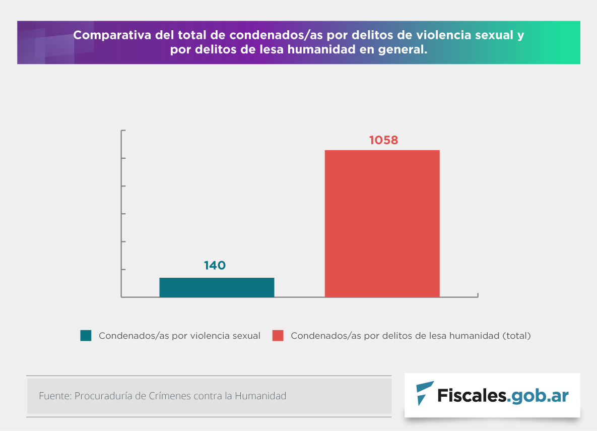 La procuraduría especializada, a cargo de la fiscal federal María Ángeles Ramos, indica que 140 de los 1058 condenados y condenadas por crímenes de lesa humanidad recibieron penas por delitos de violencia sexual. El año pasado la cifra registraba 121 condenados y condenadas de un total de 1024.