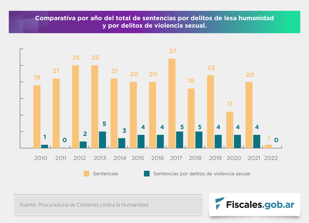 La primera sentencia que visibilizó la violencia sexual en el marco de crímenes contra la humanidad fue dictada en 2010 y fue la única de ese año. En 2012 se dictaron dos más. Los años 2013, 2017 y 2018 fueron los años con más sentencias en ese sentido, con cinco en cada uno.