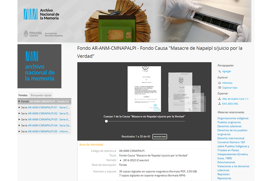 El Archivo Nacional de la Memoria (ANM) puso a disposición del público el acervo documental de la causa “Masacre de Napalpí s/Juicio por la Verdad”, en cumplimiento de la sentencia dictada por el Juzgado Federal N°1 de Resistencia, que declaró esos hechos perpetrados en 1924 como delitos de lesa humanidad, en el marco de un proceso de genocidio, y ordenó una serie de medidas de reparación para las víctimas, sus familiares y la sociedad.