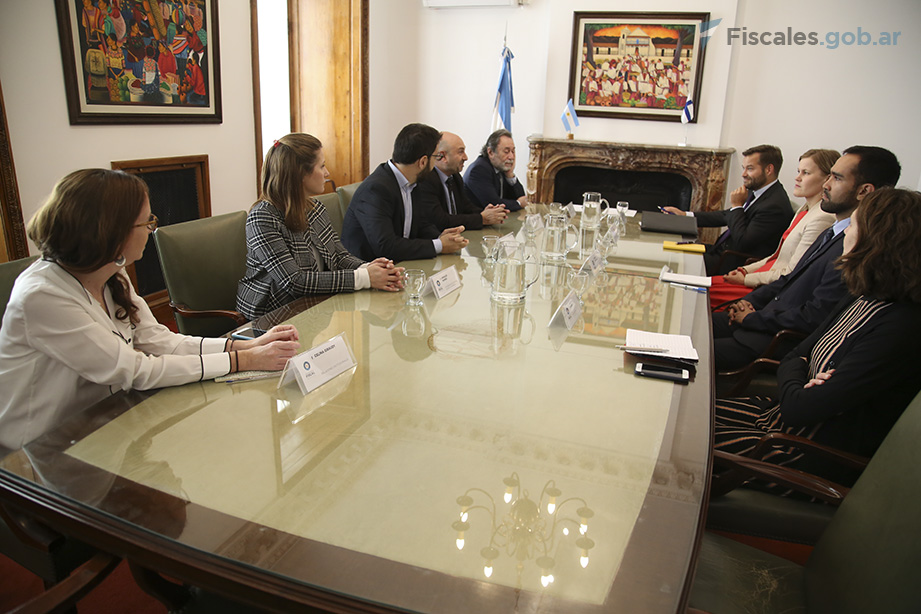 El Embajador de Finlandia en Argentina, Teemu Turunen, entregó esta mañana al fiscal general de la Procuraduría de Crímenes contra la Humanidad, Jorge Auat, documentación clasificada, mayormente sobre un caso de desaparición de la ciudadana finlandesa Hanna Hietala. Por el MPF, estuvieron presentes la fiscal Ángeles Ramos, integrante de la Procuraduría especializada; el fiscal de la Unidad de Asistencia para causas por Violaciones a los Derechos Humanos durante el Terrorismo de Estado de San Martín, Miguel Ángel Blanco García Ordás; Carolina Varsky, por la Secretaría de Coordinación Institucional, y el titular de la Dirección de Relaciones Institucionales, Luis Lozano, y la integrante del equipo Celina Giraudy. La delegación de la Embajada se completó con la primer secretaria Anna Rautvuori y el pasante Tuomas Carrasco.