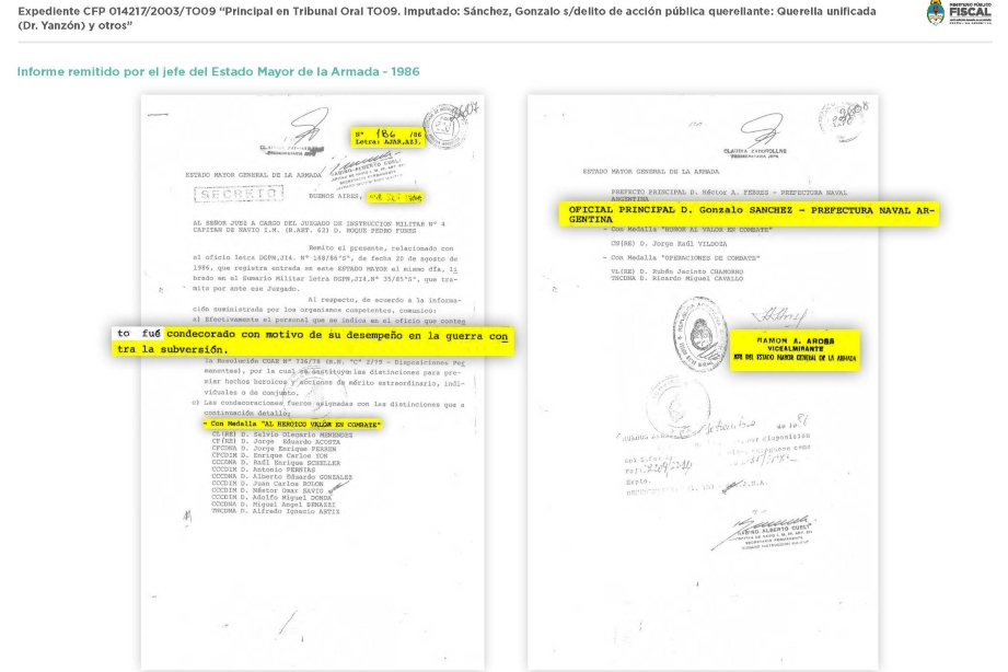 - Informe del 4 de septiembre de 1986 firmado por el Vicealmirante Ramón A. Arosa, Jefe del Estado Mayor de la Armada, relativo a 17 integrantes de la Armada Argentina y de la Prefectura Naval que fueron condecorados -según expresa textual: “con motivo de su desempeño en la guerra contra la subversión”, En este informe se detalla entre el personal condecorado por la Armada con la distinción Medalla al “Heroico Valor en Combate”, el Oficial Principal D. Gonzalo Sánchez – Prefectura Naval Argentina.