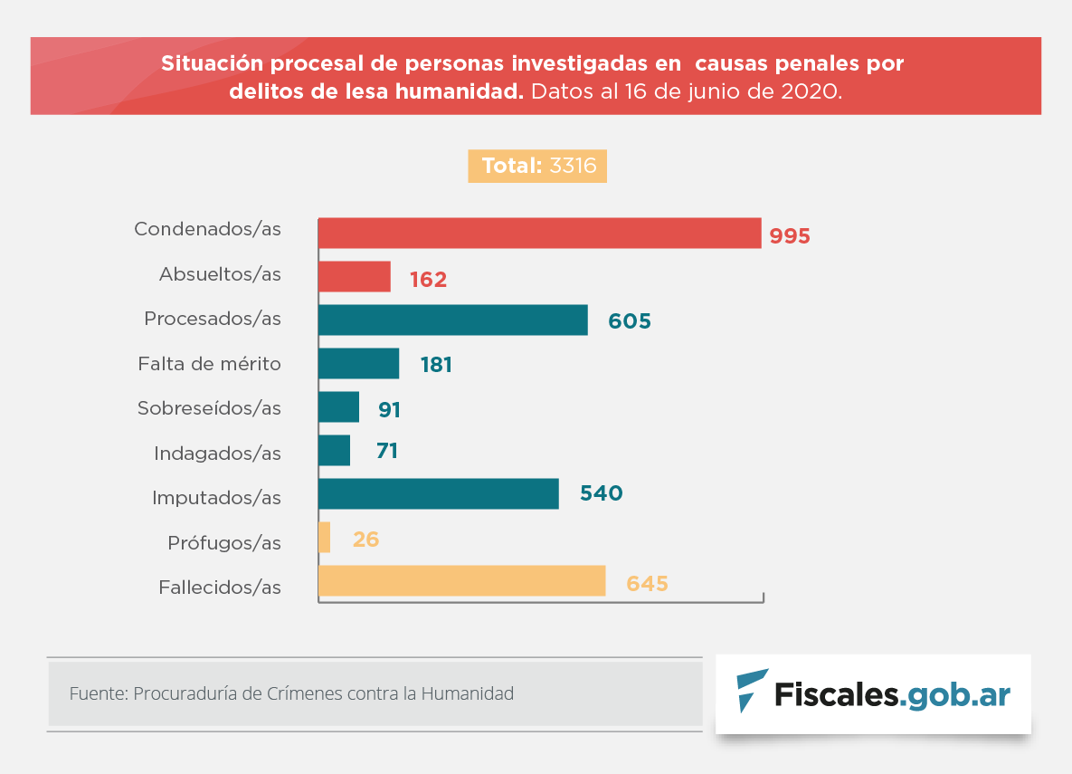 Por último, el informe de la procuraduría especializada indica un total de 3316 personas investigadas por delitos de lesa humanidad según la máxima situación procesal alcanzada, de las cuales 995 están condenadas. La cifra desagregada consta de 605 procesados, 540 imputados, 181 con falta de mérito, 162 absueltos, 91 sobreseídos, 71 indagados y 26 prófugos. Asimismo, fallecieron 645 personas vinculadas al juzgamiento de los crímenes cometidos durante la última dictadura cívico-militar.