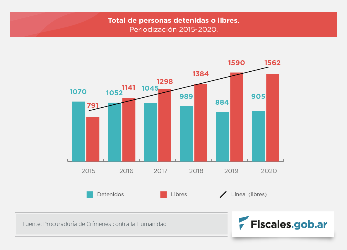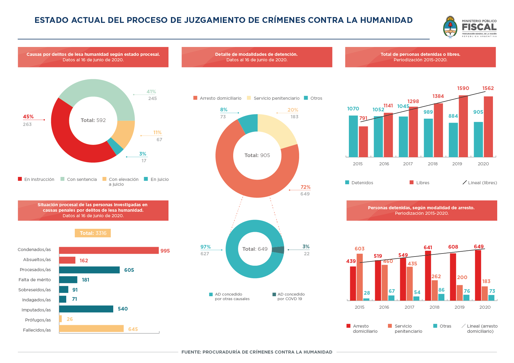 En cuanto a la condición de los imputados, en comparación con el año anterior se verifica un aumento en la cantidad de detenidos y una disminución de las personas investigadas por delitos de lesa humanidad que se encuentran libres. Mientras en 2019 el número de detenidos era de 884, el informe actual destaca que para junio de 2020 ya son 905; y que, por otra parte, mientras el año pasado la curva de personas en libertad mantenía su tendencia ascendente, alcanzando una cifra de 1590, en este 2020, luego de cinco años de un aumento constante, la cifra desciende al número de 1562.
