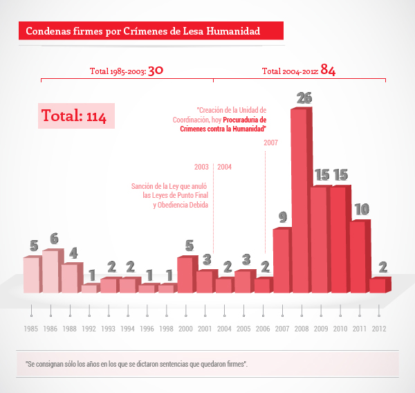 Tal como lo indica el cuadro que acompaña esta edición, la agrupación de condenas firmes por año en que fueron dictadas es la siguiente: cinco de 1985; seis de 1986; cuatro de 1988; una de 1992; dos de 1993; dos de 1994; una de 1996; una de 1998; cinco de 2000; tres de 2001; dos de 2004; tres de 2005; dos de 2006; nueve de 2007; 26 de 2008; quince de 2009; quince de 2010; diez de 2011; dos de 2012.