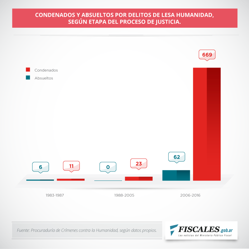 A casi diez años del comienzo del primer juicio tras la caída de las leyes de Punto Final y Obediencia Debida y a horas de cumplirse el 40° aniversario del Golpe de Estado de 1976, la Procuraduría de Crímenes contra la Humanidad actualizó las estadísticas del proceso de verdad y justicia, que muestra entre sus principales saldos la condena para 669 personas y la absolución de otras 62 en 156 sentencias dictadas desde 2006. En porcentajes, ello significa que los sentenciados han sido 31 por ciento de todos los imputados (28 por ciento de condenados y 3 por ciento de absueltos). El 25 por ciento de todos ellos tiene sentencia firme.