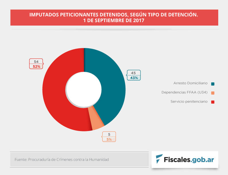 La mitad de los detenidos se encuentra alojado en dependencias del servicio penitenciario (federal o provincial) y la otra mitad la componen detenidos en arresto domiciliario o en la Unidad 34 de Campo de Mayo. La Procuraduría aclaró en su informe que no considera a esta última como una unidad penitenciaria, "en tanto se encuentra en el predio de una dependencia del Ejército".
