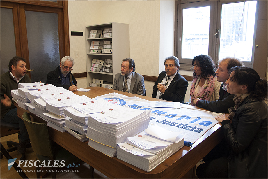 El encuentro se produjo en la sala de reuniones de la Procuraduría, en la sede de Avenida de Mayo 760 de la Procuración General de la Nación. Julián Scabbiolo, Juan José Leiva, Silvina Giganti y las hijas de trabajadores desaparecidos Silvina Atencio y Adriana Reydó integraron la comitiva que entregó los documentos a Auat.