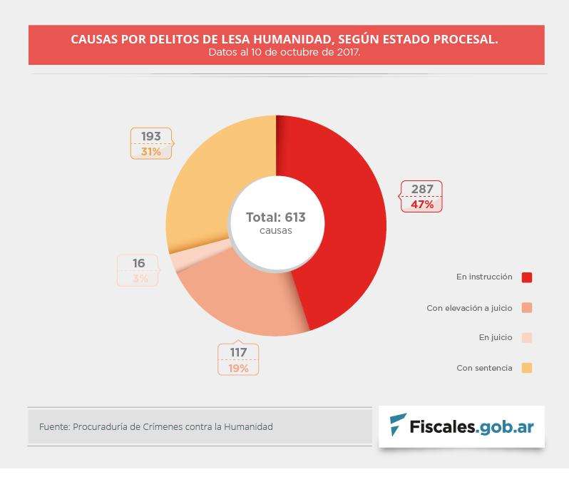 La cantidad de causas abiertas por crímenes de lesa humanidad desde 2006 es 613. 193 de ellas tienen sentencia, otras 117 aguardan la celebración del juicio oral, 16 transitan el debate y finalmente 287 se encuentran aún en la fase de instrucción.