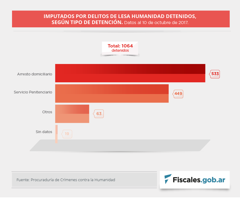Las personas detenidas en todo el país son 1064, de las cuales más de la mitad, 533, permanecen en arresto domiciliario, y 449 transitan su encierro en dependencias del Servicio Penitenciario Federal. Unas 63 están alojadas en otros recintos, como la Unidad 34 de Campo de Mayo, que funciona dentro de una instalación castrense. En otros 19 casos se carece de datos.