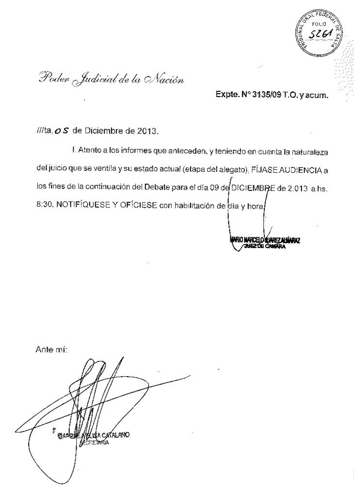 Hoy, mediante un breve decreto, el presidente del tribunal, Mario Juárez Almaráz, convocó a las partes para el próximo lunes: "Atento a los informes que anteceden, y teniendo en cuenta la naturaleza del juicio que se ventila y su estado actual (etapa de alegato), fíjase audiencia a los fines de la continuación del debate para el día 09 de diciembre de 2.013 a hs. 8:30" (sic), señala la pieza de cuatro líneas.