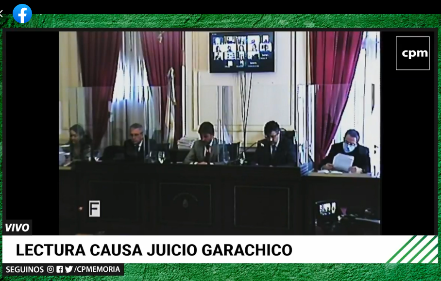 La audiencia se llevó a cabo por medios que combinaron la presencialidad y la utilización de medios remotos. Los jueces estuvieron presentes en la sala de audiencias de los Tribunales Federales de La Plata, ubicada en el primer piso del edificio situado en 8 y 50. Allí también estaban algunas abogadas y algunos abogados de la querella, parte de la fiscalía y la defensa oficial de Etchecolatz. En tanto, otro y otras integrantes de las partes acusadoras, la defensa de Garachico y los dos acusados participaron por Zoom. Etchecolatz lo hizo desde el Complejo Penitenciario Federal de Ezeiza, y Garachico, desde su domicilio en Mar del Plata.