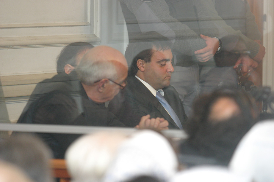 Durante el debate, un acrílico separó al acusado y a su defensa del lugar reservado al público. Foto: Garganta Bermúdez (CPM – Registro de Juicios por delitos de lesa humanidad. Juicio Von Wernich, La Plata, julio-septiembre 2007).