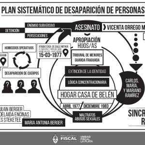 Añadieron que la sincronicidad represiva -que describieron con el gráfico presentado a continuación- incluyó los hechos padecidos por Julio Ramírez -el padre de la niña y los niños, secuestrado en 1974 y detenido al momento de los hechos de esta causa en la Unidad 9 de La Plata- y de María Antonia Berger, sobreviviente de la masacre de Trelew en 1972, cuyo padre fue asesinado en el procedimiento del 16 de marzo juzgado en esta causa.