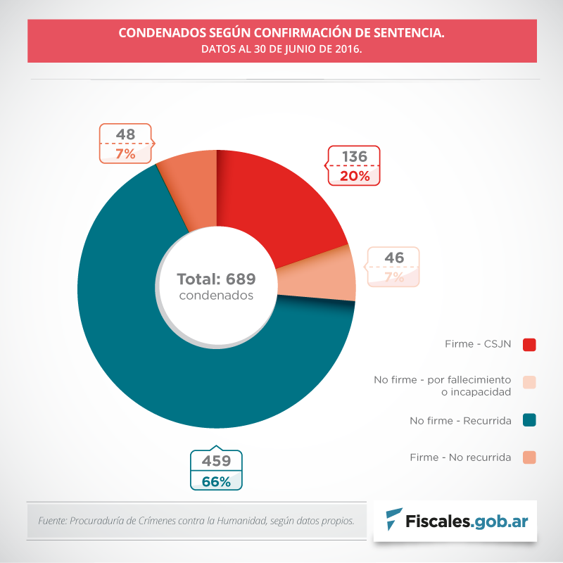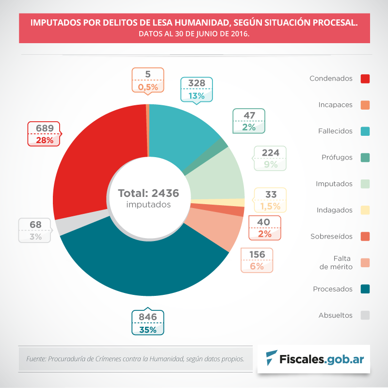 Al finalizar el primer semestre de este año, se registraron 539 causas por crímenes de lesa humanidad en todo el país, en las que fueron imputadas 2436 personas. Desde los primeros juicios orales en 2006 tras la reapertura de los procesos, se dictaron 163 sentencias en las que fueron condenados 689 acusados y resultaron absueltas otras 68. Los procesados actualmente son 846, lo cual da una idea de lo que aún queda por juzgar.