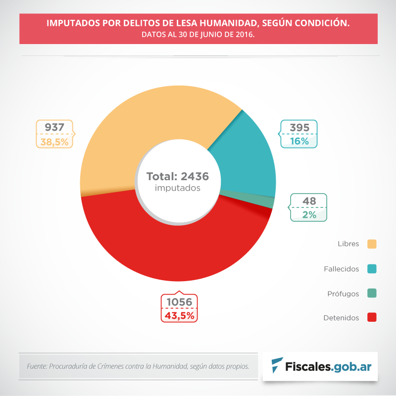 La diferencia entre imputados detenidos y libres es de 119: con prisión domiciliaria o en la cárcel suman 1056 personas, mientras que otras 937 están excarceladas y gozan de libertad. "Estas cifras desmienten afirmaciones que sostienen que a los imputados se los detiene sin excepción", indicó la Procuraduría. Hay, además, 48 prófugos. Un 16 por ciento de los 2436 imputados, es decir, 395, falleció.