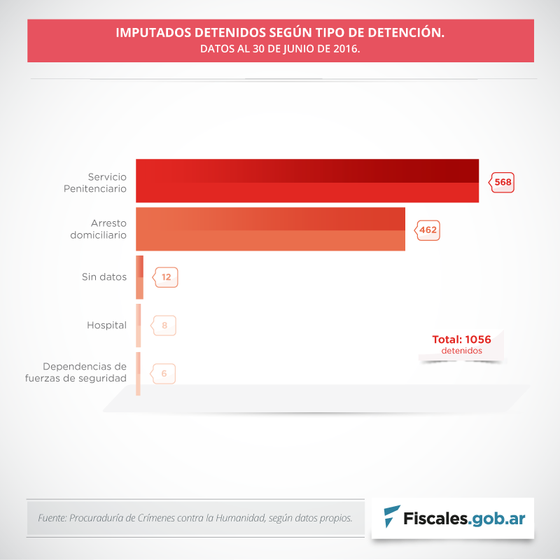 Entre los 1056 detenidos, hay 106 más en la cárcel (568, el 54%) que en prisión domiciliaria (462, el 44%). En tanto, 8 imputados están en hospitales y otros 6 se encuentran alojados en dependencias de fuerzas de seguridad. Hay 12 casos en los que no se cuenta con datos.