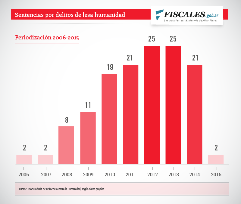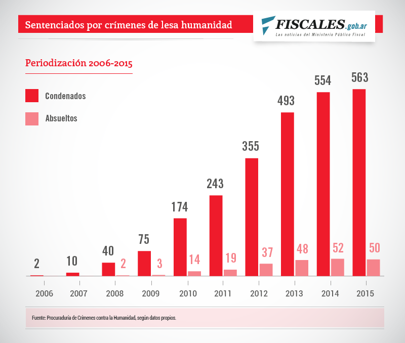 Entre 2006 y lo que va de 2015, 613 personas fueron sentenciadas en procesos por crímenes de lesa humanidad: 563 resultaron condenadas y 50 fueron absueltas. El estado de situación muestra que hay un total de 456 expedientes en trámite en todo el país. Entre éstos, hay 16 juicios en curso y 120 causas próximas a debate. Las víctimas judicializadas en todo el país son más de diez mil. Y existe un total de 889 procesados que aún no fueron condenados y otros 247 que ya fueron juzgados en otras causas.
