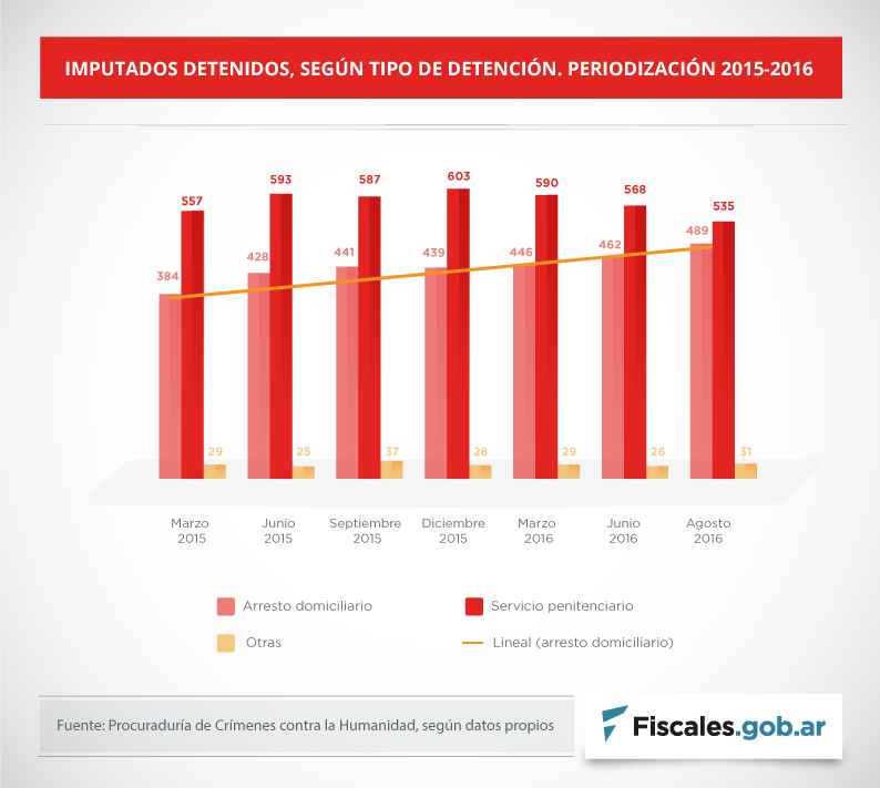 La Procuraduría de Crímenes contra la Humanidad presentó un estudio detallado de la situación de las personas imputadas por esos delitos en todo el país que revela que, desde marzo de 2015 a agosto pasado, se registra "una tendencia creciente en el número de imputados con arresto domiciliario". En ese período la cantidad de quienes accedieron a ese benefició ascendió de 384 a 489.