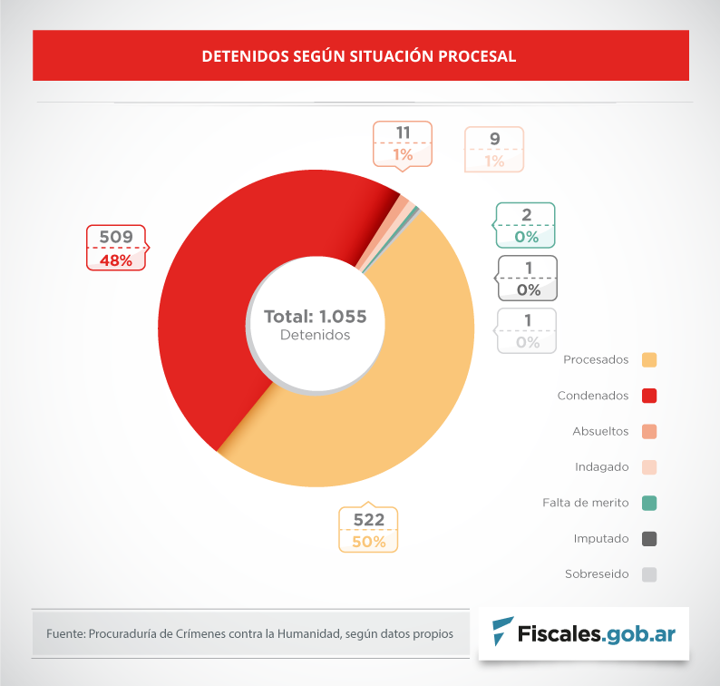 Entre los 1055 detenidos, 522 están procesados (casi el 50 por ciento), 509 (48 por ciento) condenados y hay 11 (1 por ciento) absueltos pero procesados en otras causas. El resto, 13, son personas con falta de mérito y sobreseídos con detenciones en otras causas, e indagados y detenidos sobre los que a la fecha de cierre de los datos no se había resuelto su situación procesal.