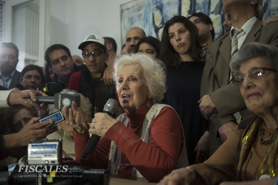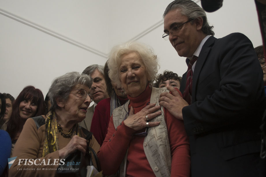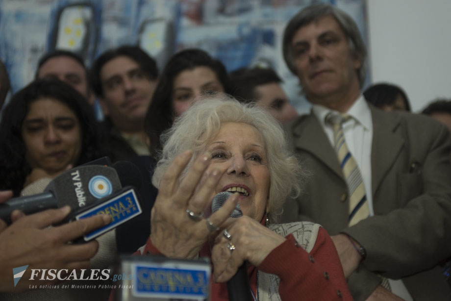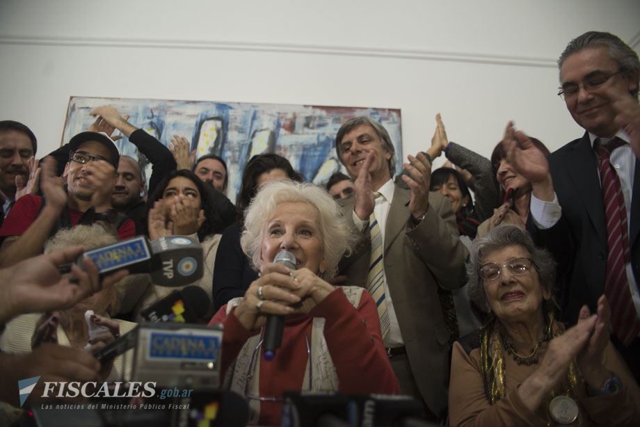 Interrumpida varias veces por aplausos, gritos y cánticos; rodeada de sus hijos, el diputado nacional por el Frente para la Victoria Remo Carlotto y Claudia; el ministro de Justicia y Derechos Humanos, Julio Alak; el secretario de Derechos Humanos, Juan Martín Fresneda, y los nietos recuperados Horacio Pietragalla y Victoria Montenegro, la titular de Abuelas se refirió a su nieto y señaló: “No quería morirme sin abrazarlo, y ahora voy a poder hacerlo”.