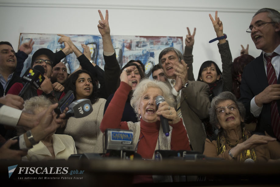 Estela de Carlotto ingreso a la sala y una multitud la recibió con un aplauso, Ante periodistas de todos los medios y acompañada de varias de sus compañeras de lucha, de nietos recuperados, militantes y colaboradores, anunció oficialmente que había encontrado a su nieto, Guido. La titular de Abuelas de Plaza de Mayo dijo emocionada: “Quiero compartir esta alegría enorme que me regala la vida, esto es un premio para todos, para todas las Abuelas, para todo el pueblo argentino”. Y recordó que durante el secuestro, su hija les decía a los militares “mi mamá no se va a olvidar de lo que me hacen, no se los va a perdonar”. Estela agregó: “Laura sonríe desde el cielo y debe estar diciendo: les ganaste, mamá”.