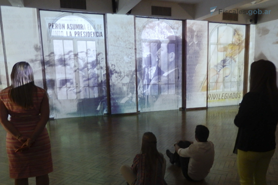 La visita finalizó en la planta baja, en el Salón Dorado, donde se mostró una nueva proyección de videos con información de la megacausa ESMA.