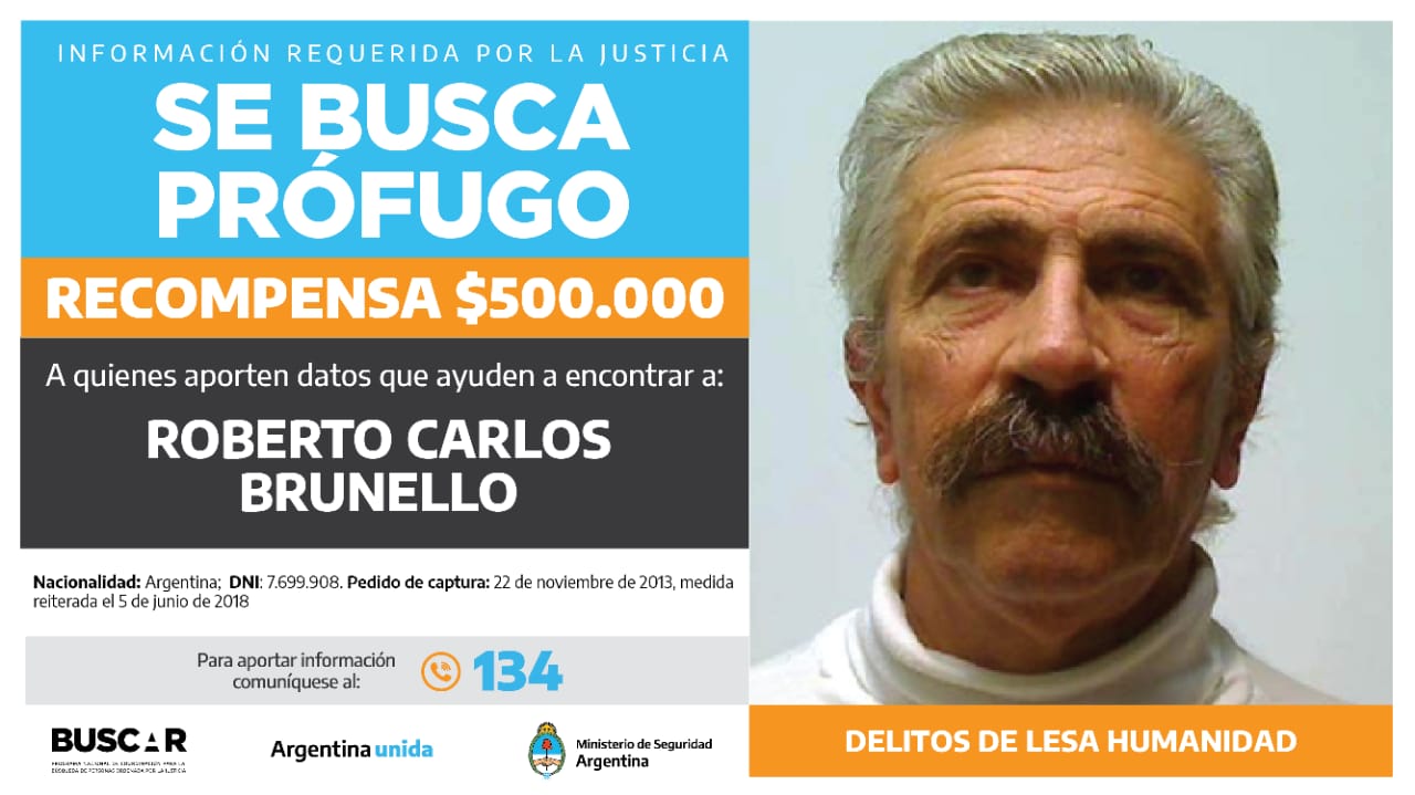 El Ministerio de Seguridad de la Nación informó, mediante la Resolución N° 243/2020 publicada en el Boletín Oficial, que ofrece una recompensa de 500 mil pesos a quienes aporten datos útiles que permitan lograr la captura del ex teniente Roberto Carlos Brunello, con documento nacional de identidad número 7.699.908, imputado por crímenes de lesa humanidad cometidos en Bahía Blanca durante la última dictadura cívico militar, en la causa donde se investiga el accionar del V Cuerpo del Ejército. El Juzgado Federal N° 1 de esa ciudad solicitó dar difusión de la búsqueda del paradero del imputado.