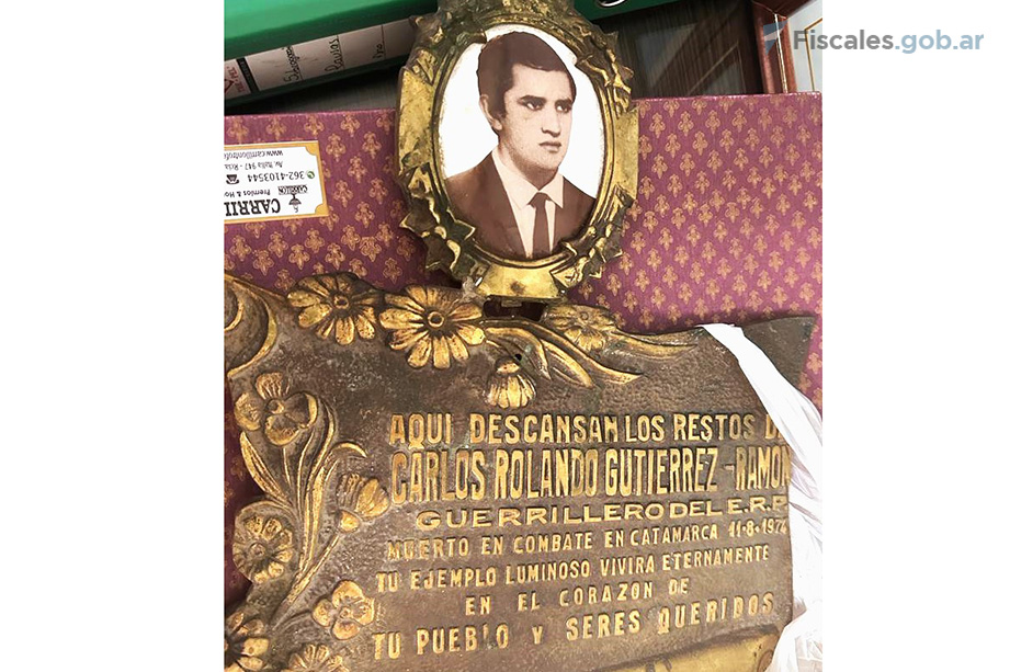 La placa tiene la leyenda: "Aquí descansan los restos de Carlos Rolando Gutiérrez-Ramon, guerrillero del ERP, muerto en combate en Catamarca 11/08/1974. Tu ejemplo luminoso vivirá eternamente en el corazón de tu pueblo y seres queridos”.