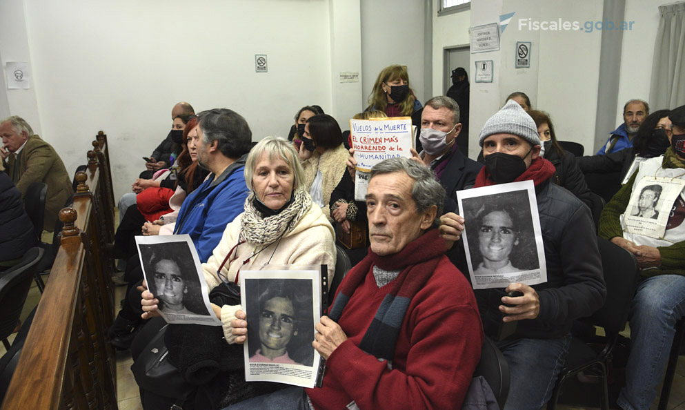 En su alegato, el representante del Ministerio Público Fiscal destacó que los imputados “formaron parte del engranaje represivo que permitió que los hechos criminales sucedieran y dejaran un número altísimo de víctimas del terrorismo de Estado”. Para el fiscal, durante el debate se probó también su compromiso previo de eliminar todo rastro posible relativo a las personas a quienes ya se había decidido quitarles la vida en virtud de cómo fue pensado el sistema clandestino y represivo. Por ello, y tal como se afirmó durante la etapa de instrucción, consideró que “resultaba intrascendente que las víctimas estuvieran vivas o muertas cuando fueron arrojadas a las aguas del mar argentino desde los aviones de la muerte, por cuanto el aporte realizado por los imputados fue previo, coordinado, organizado y subsumido en el plan sistemático de exterminio”.