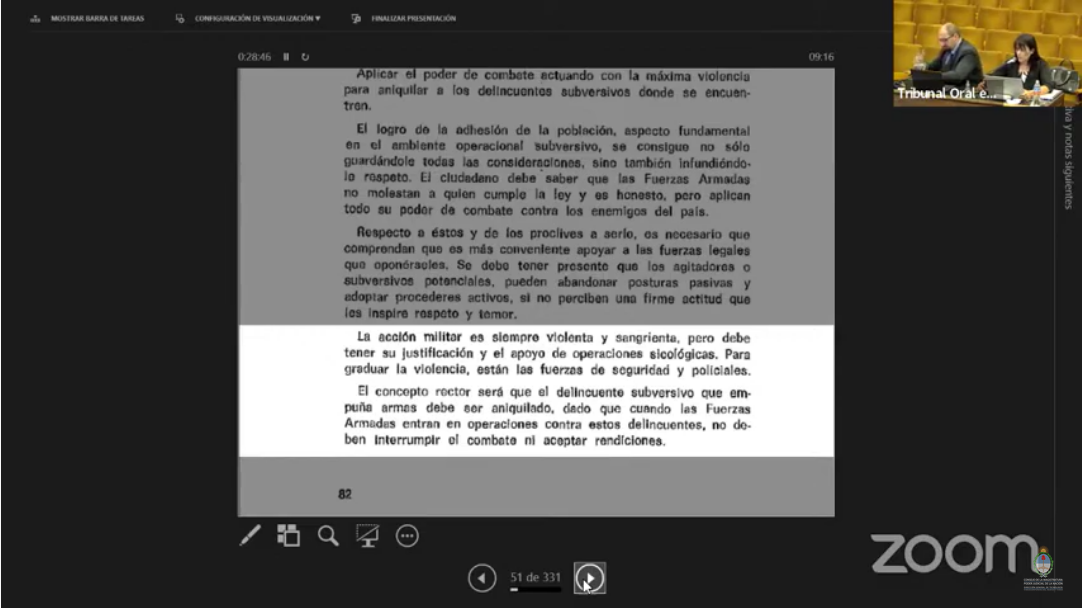 Pasadas las 8.30, en una audiencia que se hizo de forma semipresencial, la fiscala, que estaba presente en la sala, comenzó con la lectura del alegato, en el que hizo una caracterización del contexto, la descripción del despliegue territorial de la Subzona 1.4 y la enunciación de los hechos por los cuales se acusa a los imputados.