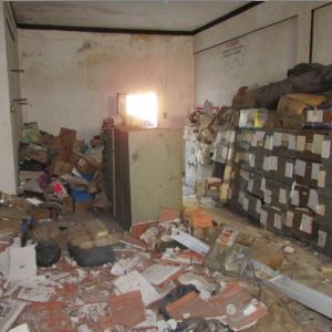 La documentación estuvo guardada durante años en una habitación cuyo techo se cayó a pedazos sobre el archivo. Imagen de archivo remitida por la Unidad Fiscal de Santiago del Estero.