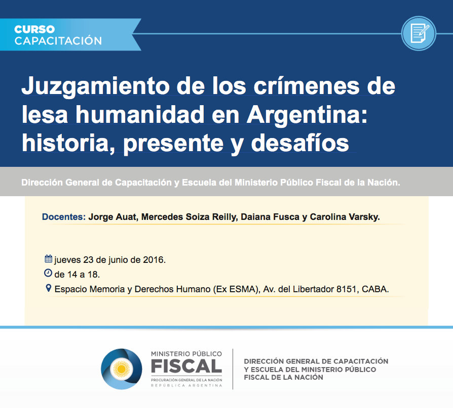 La Dirección General de Capacitación y Escuela del Ministerio Público Fiscal de la Nación organiza el curso “Juzgamiento de los crímenes de lesa humanidad en Argentina: historia, presente y desafíos”. El encuentro se llevará a cabo el jueves 23 de junio en el Espacio Memoria y Derechos Humanos (ex ESMA), ubicada Avenida del Libertador 8151, y contará con la presencia del titular y la coordinadora de la Procuraduría de Crímenes contra la Humanidad, Jorge Auat y Carolina Varsky, respectivamente; la fiscal Mercedes Soiza Reilly, y la integrante de la Procuraduría de Crímenes contra la Humanidad, Daiana Fusca.