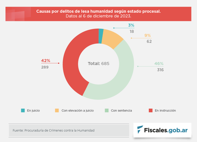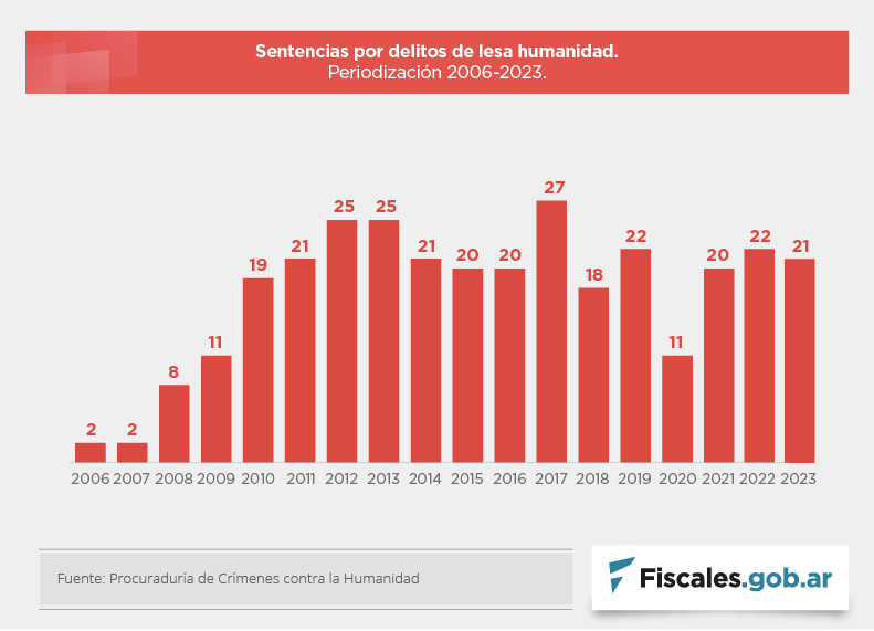 "Este 2023 se cumplen 17 años desde la primera sentencia en causas de lesa humanidad luego de la reapertura de las investigaciones judiciales que fueron interrumpidas por las leyes de impunidad y los indultos, y 47 años desde el inicio del contexto represivo en el que se cometieron los crímenes", señala la Procuraduría de Crímenes contra la Humanidad en su informe anual y destaca que el proceso de juzgamiento iniciado con los primeros debates realizados en 2006 permitió juzgar a 1357 personas, de las cuales 1173 resultaron condenadas y 184 absueltas, en 316 sentencias.