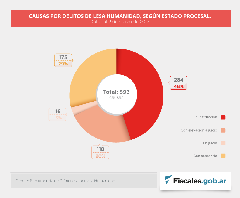 La situación de todas esas personas ha tramitado y tramita en 593 causas judiciales abiertas desde el reinicio de los juicios, de las que formaron parte otras 257 que fueron unificadas a aquellas, dando lugar a las que se denomina "megacausas". De todos esos expedientes, al 2 de marzo pasado se había dictado sentencia en 175. Otros 284 se encuentran en la etapa instrucción. A esas cifras se suman las 118 elevadas a juicio oral y público.