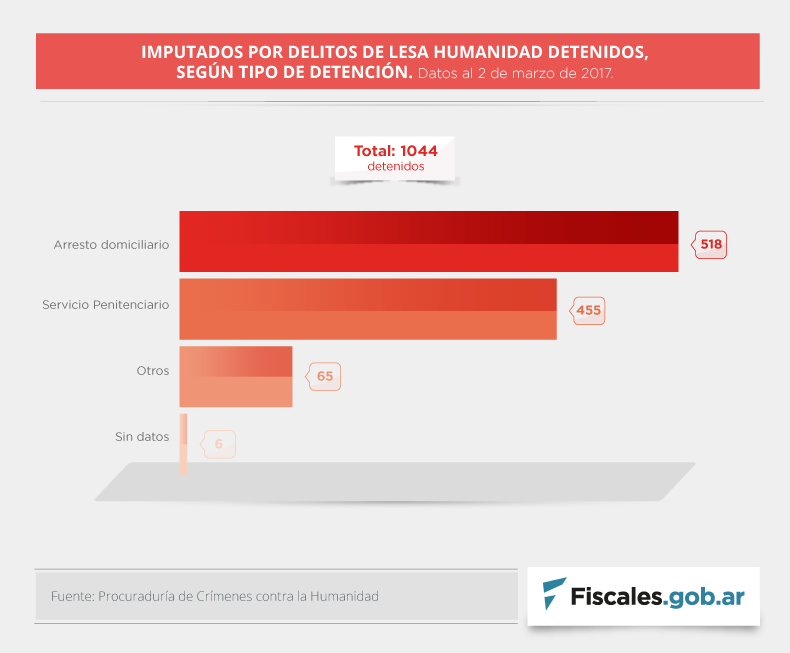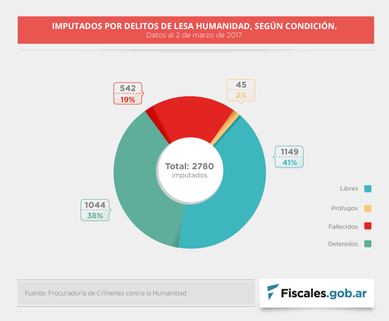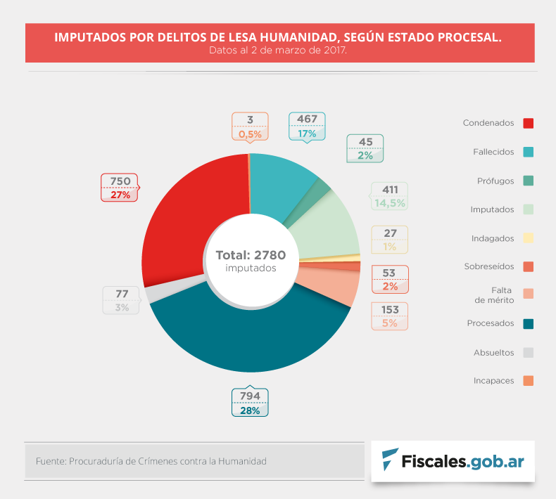 Desde la reapertura de los procesos judiciales y la realización de los primeros juicios en 2006, 827 personas fueron sentenciadas en Argentina por crímenes de lesa humanidad, 750 de las cuales resultaron condenadas y 77 absueltas, según el último informe de la Procuraduría de Crímenes contra la Humanidad. Los sentenciados, así, son alrededor del 30 por ciento de los 2780 imputados por crímenes de lesa humanidad en más de una década en todo el país.