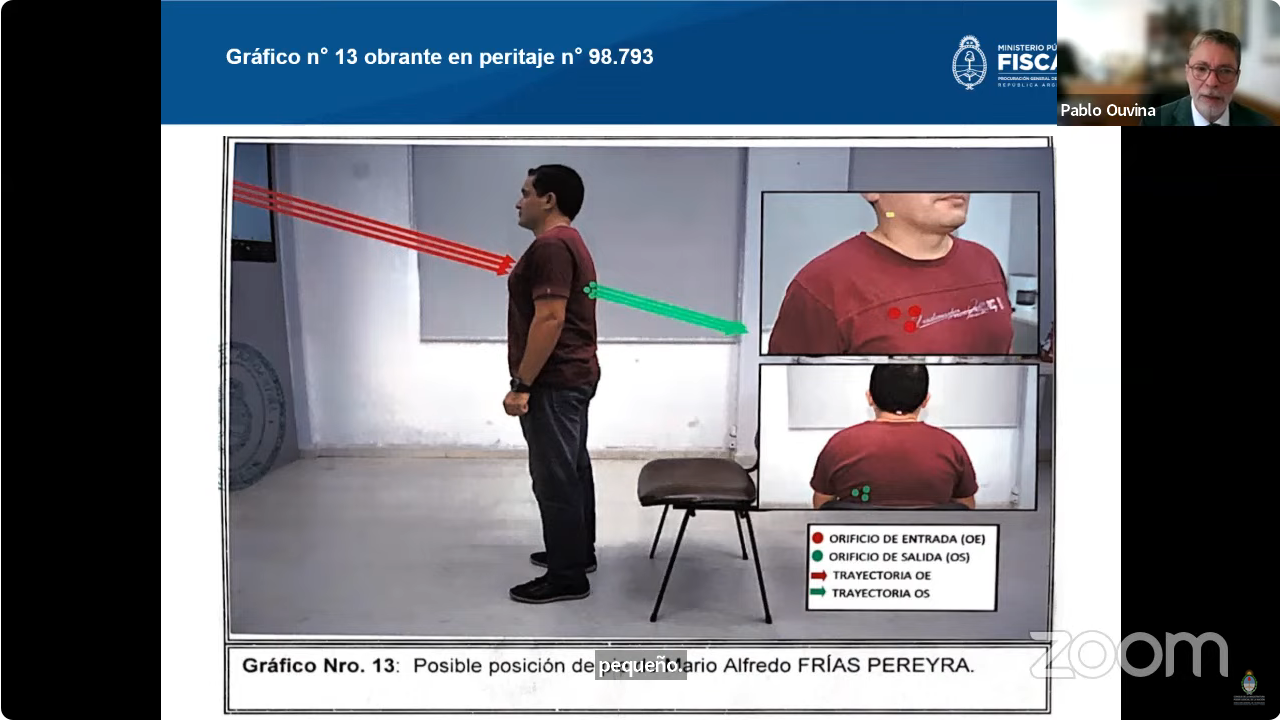 En el caso de Frías además analizó los disparos que recibió en el pecho y la trayectoria de los proyectiles, que indican -de acuerdo con los peritajes realizados por personal especializado de la Gendarmería Nacional- que "claramente el tirador tenía que estar en un punto alto, muy alto de la víctima", por lo que "de las posibilidades consideradas la más razonable es que [el hombre] haya estado sentado o, a lo sumo, levantándose de la silla" fotografiada junto a su cuerpo.