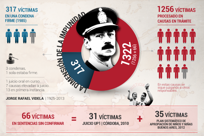 Después de un ir y venir de 30 años en los tribunales, indultos mediante, Videla recibió condena firme por diferentes delitos que afectaron a 317 víctimas, mientras que los crímenes que afectaron a otras 1322 quedaron en el camino de procesos judiciales cuya conclusión -respecto del dictador- se vio frustrada por su deceso.