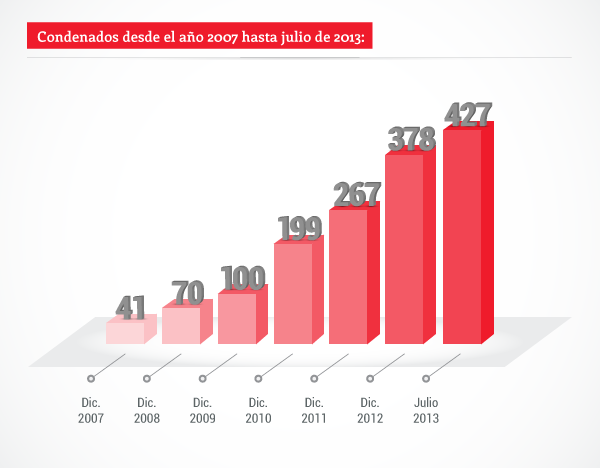 Los números demuestran que la cantidad de condenados ascendió más de diez veces entre diciembre de 2007, cuando se registraban 41, y julio de 2013. Ello indica que "el número de condenados continúa creciendo exponencialmente", destaca el informe.