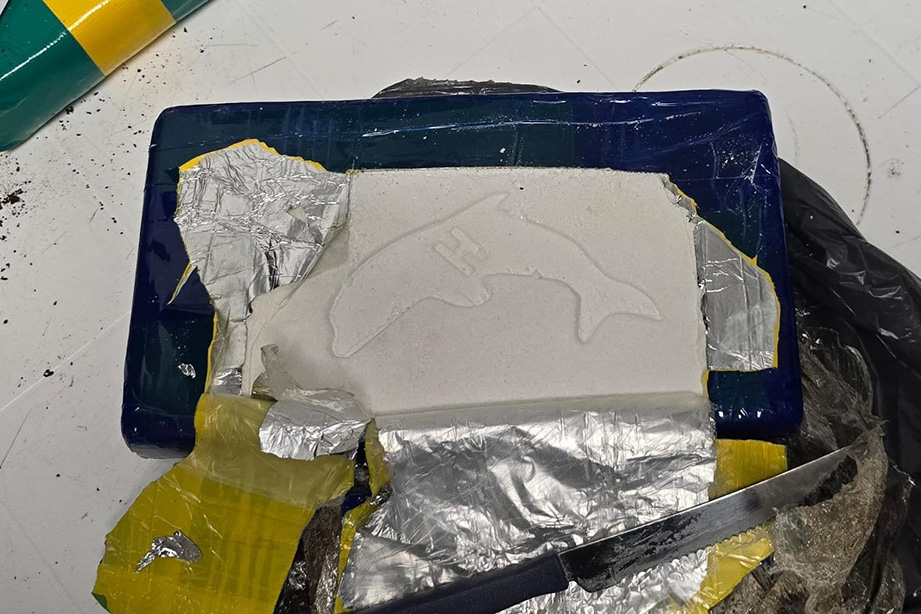 Uno de los ladrillos de cocaína secuestrados, con la marca en bajorrelieve de un delfín. Foto: noticias.santacruz.gob.ar