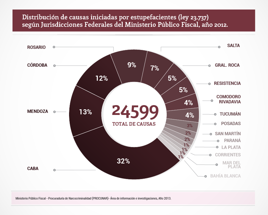 Los números forman parte de las conclusiones de un relevamiento realizado por la Procuraduría de Narcocriminalidad (Procunar) en base a todas las investigaciones registradas durante 2012 en el sistema informático del Ministerio Público Fiscal de la Nación, Fiscalnet, que incluye puntualmente el procesamiento de la información de las fiscalías nacionales en lo criminal federal de todo el país y en las fiscalías nacionales en lo penal económico con asiento en la Ciudad Autónoma de Buenos Aires.