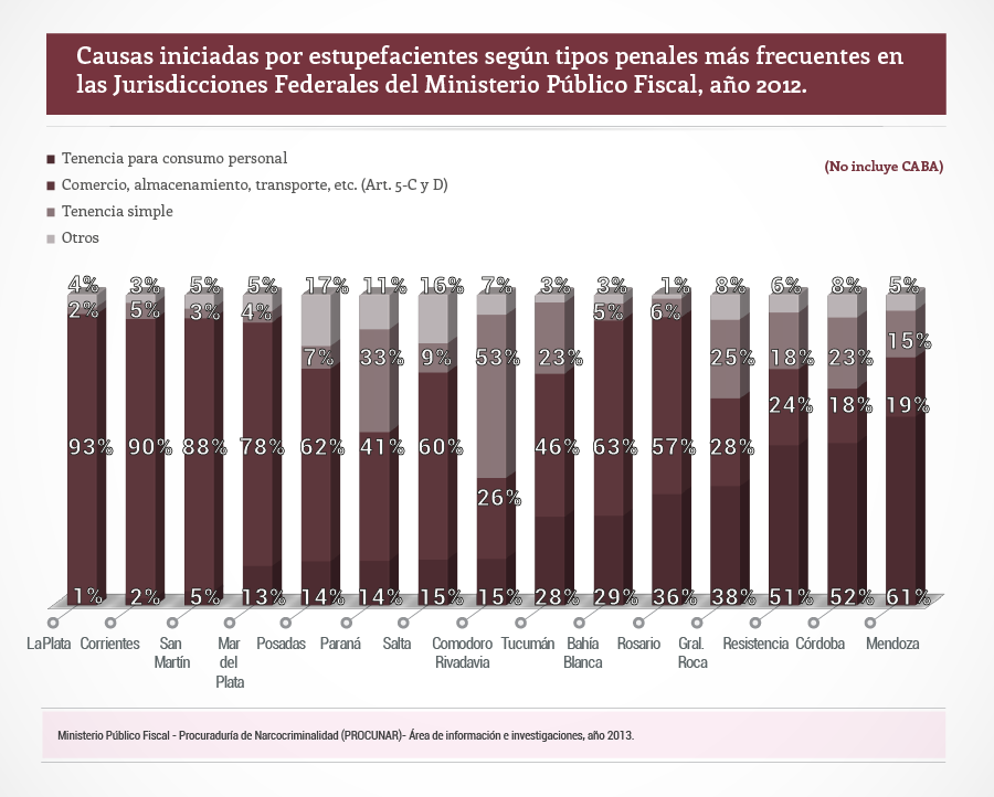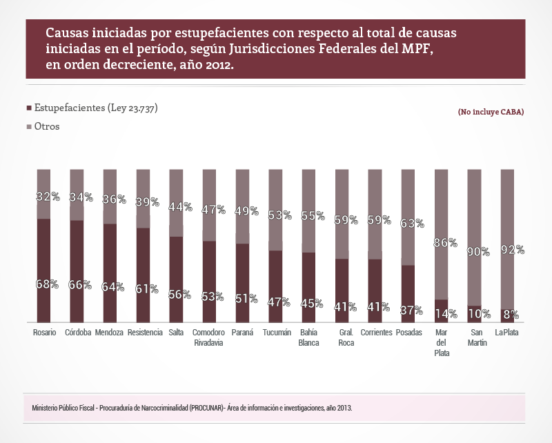 En tanto, las jurisdicciones con mayor proporción de causas por comercio, almacenamiento y transporte de estupefacientes, previstas en los incisos C y D del artículo 5 de la ley 23737, son La Plata, 93 por ciento; Corrientes, con el 90 por ciento; Mar del Plata, 78 por ciento; San Martín, 88 por ciento; y Bahía Blanca, 63 por ciento. .