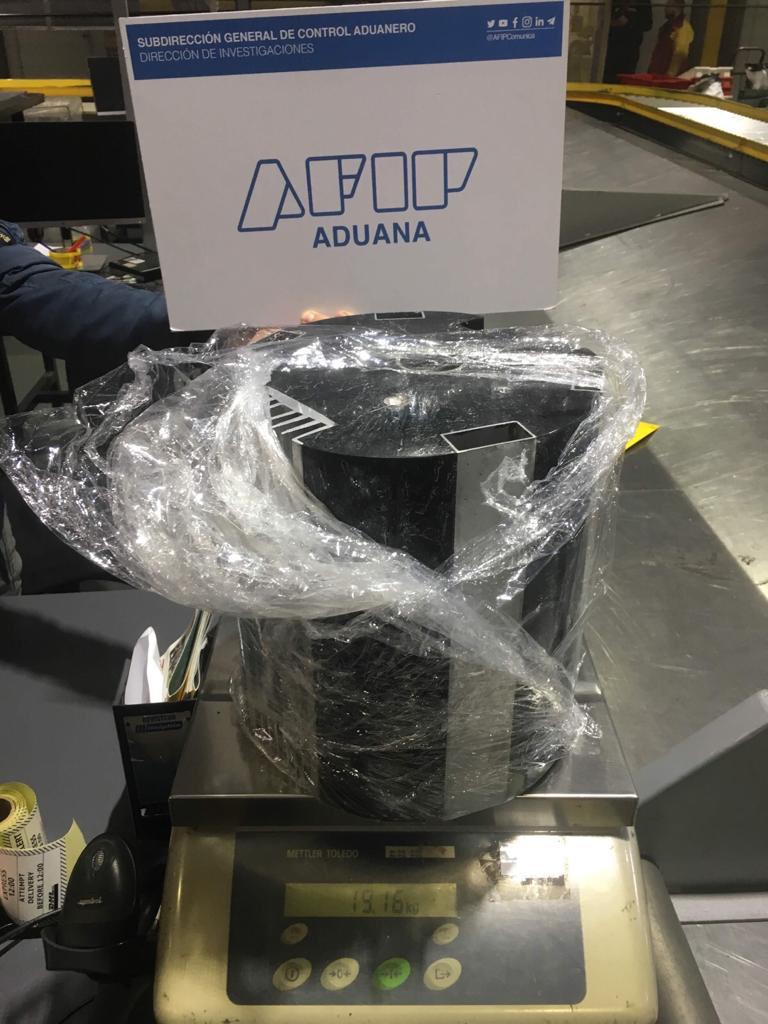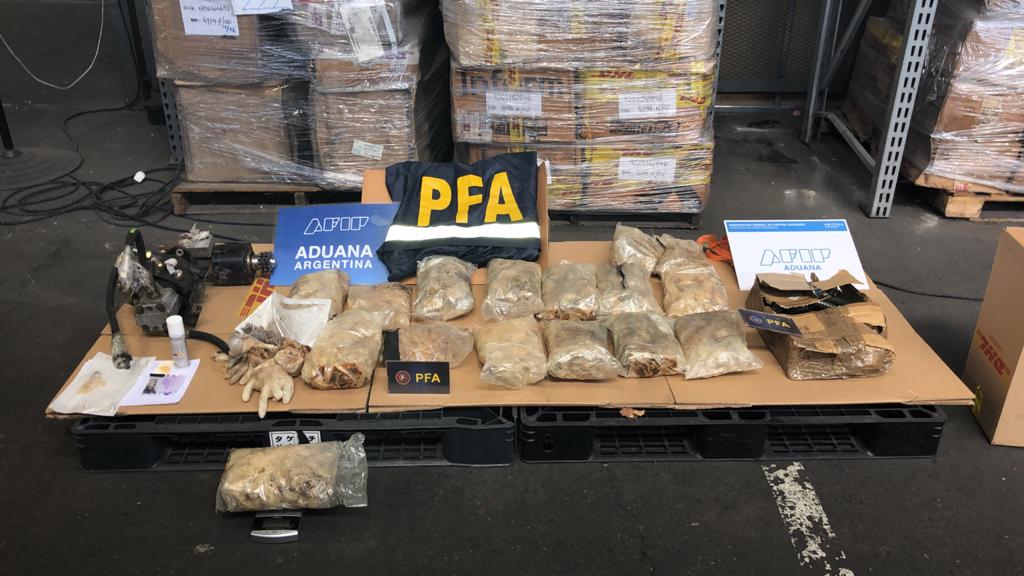 Posteriormente, gracias a la labor desplegada hasta el momento por parte de personal de la División Investigaciones del Narcotráfico de la Dirección General de Aduanas y la implementación de una alerta de detección proactiva, tuvo lugar el hallazgo de clorhidrato de cocaína en el interior de una encomienda de 19,16 kilogramos que tenía como destino el Reino de España, y se encontraba en la sede de la firma “DHL Express Argentina S.A.”.
