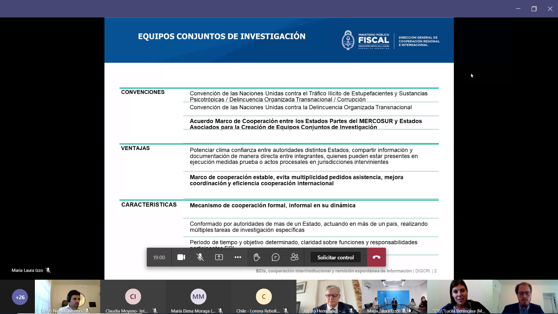 En las presentaciones realizadas mediante videoconferencia, los y las representantes chilenas y argentinas destacaron que la constitución de un ECI permite establecer un marco de cooperación y coordinación estable entre autoridades competentes en un caso concreto, lo cual impacta ampliamente en una mayor eficiencia y celeridad y evita el libramiento de múltiples solicitudes de asistencia jurídica internacional.