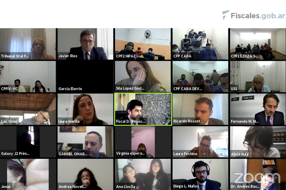 La audiencia se realizó de manera virtual mediante una plataforma provista por el Consejo de la Magistratura de la Nación y transmitida por YouTube. Parte de los acusados siguieron el alegato desde sus lugares de detención en Ezeiza, Marcos Paz y Devoto.
